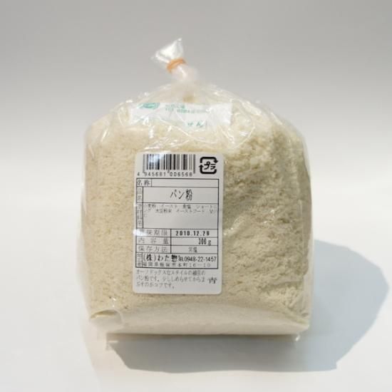 オーソドックスなスタイルの細目のパン粉です。少ししめらせてからまぶすのがコツです。(ぱんこ)| 原材料 | 小麦粉(国内製造)、砂糖、ショートニング、イースト、食塩、大豆粉/イーストフード、V、C |