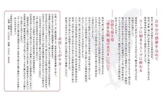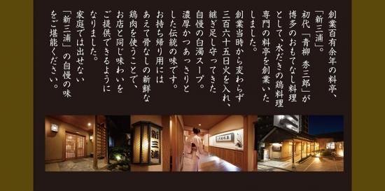 明治43年創業。博多の名店で知られる「新三浦」の鶏の水だきをご自宅でお楽しみいただけます。 創業百余念の料亭「新三浦」。初代「青柳 秀三郎」が博多のおもてなし料理として、水だきの鶏料理専門の料亭を創業しました。 創業当時から変わらず三百六十五日火を入れ、継ぎ足し守ってきた自慢の白濁スープ。濃厚かつあっさりとした伝統の味です。お持ち帰り用にはあえて骨なしの新鮮な鶏肉を使うことで、お店と同じ味わいをご提供できるようになりました。 家庭では出せない「新三浦」の自慢の味をご堪能ください。 【セット内容】 ・骨なし鶏肉…330g ・白濁スープ…400g ・ポン酢…200g 【賞味期限】 ・冷凍…90日 ★ご一読下さい★≪冷凍便≫商品と、≪通常便・クール便≫商品は同時にご注文できませんので、ご注意ください。 #水炊き