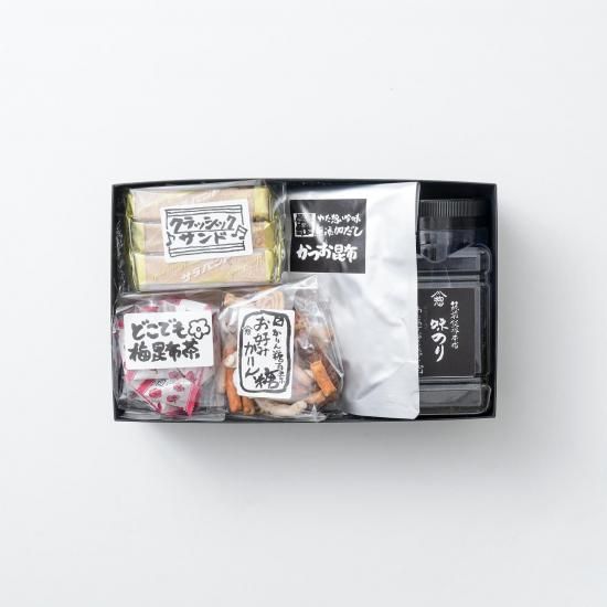 <セット内容>・味付け海苔(72枚)・かつお昆布だし(7パック)・クラシックサンド(10本)・どこでも梅昆布茶(15個)・お好みかりんとう(70g)
